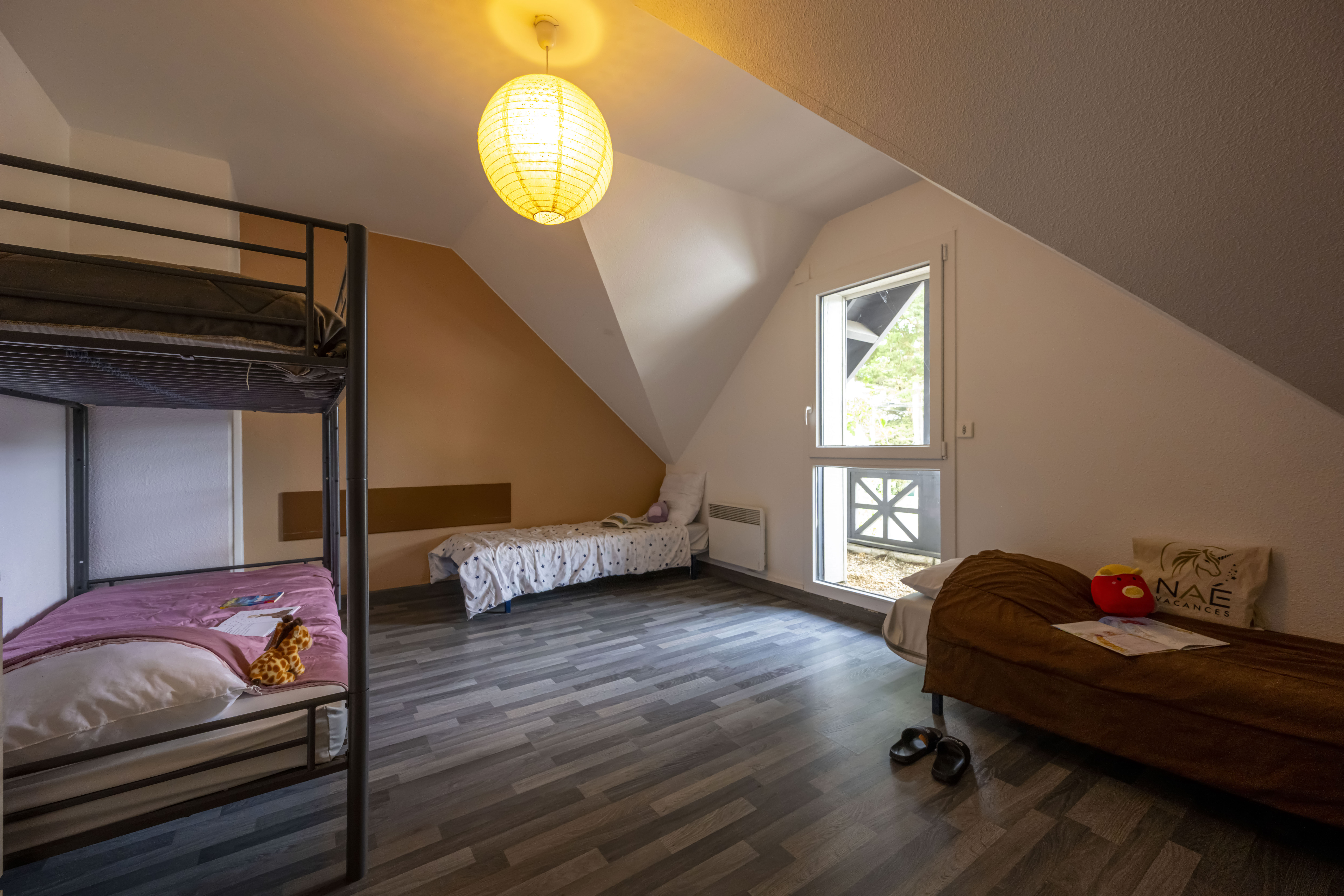 Upstairs, you will find a bedroom with a double bed (140 x 190) as well as a bedroom with two or four single beds (80 x 190). On the ground floor, the living area includes a sofa, a dining area, a television, and WiFi. The bathroom is equipped with a sink and a shower, and the toilet is separate.