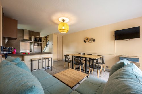 The fully equipped kitchen includes a refrigerator, a microwave grill, a dishwasher, a coffee maker, a Tassimo coffee machine, a toaster, a kettle, and a vacuum cleaner. You can also enjoy a private garden with a wooden terrace furnished with a table and garden chairs, an umbrella, two sun loungers, a plancha, and a private SPA.